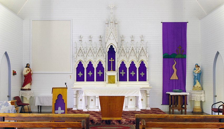 The original painted marbling and stone decoration of the altar was painted out, probably in the late 1960s, and to become the current white with gold trim. It was retouched in the 1990s but was left unfinished. Before the church's centenary (2027) we plan to have it properly repainted. The altar, as was common with those made in the same period, was built with the capacity to hold art within the six arches of the retable. Custom designed and made frames allow art to be inserted without the need for any fixtures, and thus without making any change to the piece nor inflicting any damage to it. This also allows us to have a more dynamic approach to the inclusion of art than would usually be possible; we hope for one set to create a form of Iconostasis, and during certain liturgical season, such as Lent, to use colours or art proper to that time.